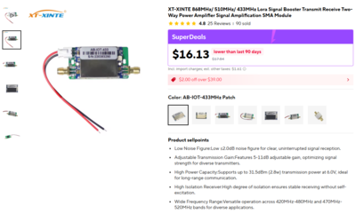 Fortunately, some of the above products already run +30 dBm or so (select QRP-Labs units and hopefully soon RPC Electronics). All the others could use an amp to get the best coverage. And there's a relatively inexpensive, high performance solution. The AB-IOT-433 (this link may not be very stable, there are a ton of vendors selling them, and they change names and prices all the time, it seems) unit is a really easy-to-use bidirectional amp that provides 11 dB transmit gain (can output over 2 watts!) and claims to have a low-noise receiver amp with <2.0 dB noise figure (the Semtech chip advertises a 6 dB NF, so this amp is at least 3-4 dB better). Here's a picture of the amp in case that link doesn't work.