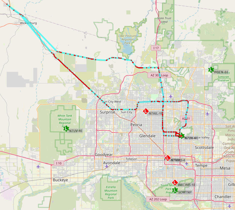 Here's a screen grab from aprs.fi of my N7UV-4 LoRa mobile last week when I went on a trip to Death Valley and back. Obviously, once I got away from the infrastructure here in the valley, there wasn't any coverage. But what pleasantly shocked me was the range performance to the NW side of Phoenix. Those few position locations NW of Wickenburg are nearly 60 miles away, and skirting the ground for a lot of that. Wickenburg itself is mostly in a river valley so I don't expect coverage there.